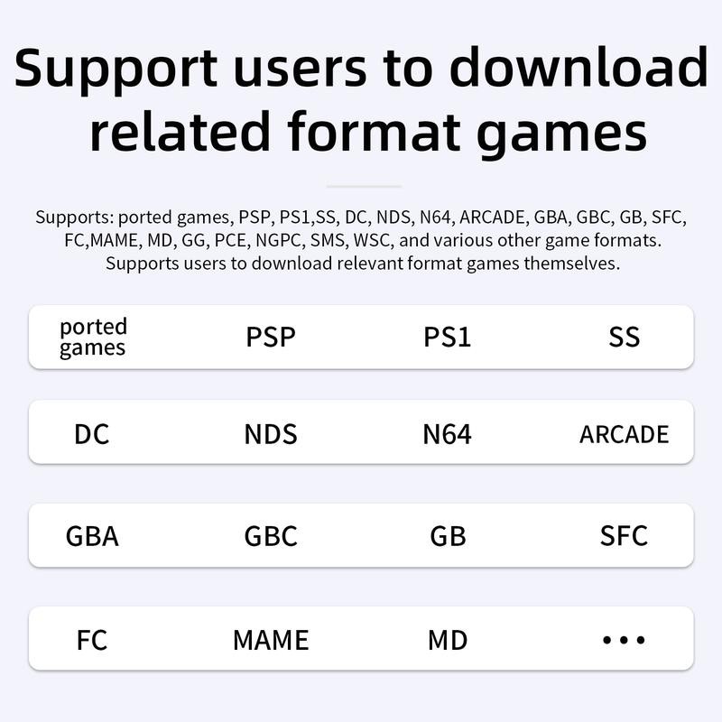Color White/Transparent black/Indigo blue Screen 4.0-inch IPS screen, OCA full lamination, resolution: 640*480 CPU H700 quad-core ARM Cortex-A53, 1.5GHz frequency GPU Dual- core G31 MP2 RAM LPDDR4 1GB Storage 64GB TF/MicroSD System Linux 64-bit Games Supports: ported games, PSP, PS1,SS, DC, NDS, N64, ARCADE, GBA, GBC, GB, SFC, FC, MAME, MD, GG, PCE, NGPC, SMS, WSC, and various other game formats. Supports users to download relevant format games themselves. WIFI/Bluetooth 2.4/5G WIFI 802.11a/b/g/n/ac, Bluetooth 4.2 Multi-media Video player supports formats such as "wmv", "avi","rmvb", "flv", "mp4", "3gp", "asf", "mov", "mpg","mkv" etc. Music player supports formats such as "flac", "mp3", "wav", "ape", "aif", "aiff", "ogg", "wma", "aac", "m4a", "m4r" etc. file manager, and e-book reader (supports txt format) Language Chinese, English, Japanese, Korean, Russian, French, German, Portuguese, Spanish Speaker High-fidelity speaker TF card Dual card slots, support TF card expansion, maximum 512GB Battery Li-polymer battery 3200mAh, lasting 6 hours Charging 5V/1.5A, support C2C charger RGB lighting effect 16 million color RGB joystick lighting, support constant light, breath, rainbow, marquee, chasing, gaming and other light effects, support customize the color and adjust the brightness. Other function Supports 2.4G wireless controller and wired controller connection, HDMI connection to TV, vibration motor, WIFI online pairing, streaming Accessories USB charging cable,giftbox, user manual