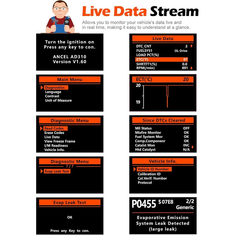 • CEL Doctor: The ANCEL AD310 is one of the best-selling OBD II scanners on the market and is recommended by Scotty Kilmer, a YouTuber and auto mechanic. It can easily determine the cause of the check engine light coming on, quickly read and clear diagnostic trouble codes, read live data & hard memory data, view freeze frame, I/M monitor readiness and collect vehicle information. Instead of taking car to mechanic shop, you can use it to check the trouble code and show code definition by yourself.