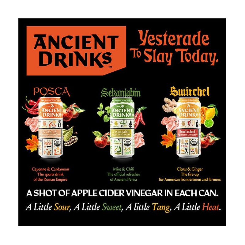 ANCIENT DRINKS Apple Cider Vinegar Beverage with Electrolytes, Vitamins, & Probiotics, Organic, Super-Hydrating Sports Drink - Mixed Pack (Posca, Switchel, Sekanjabin) - 16 fl oz (12 cans)