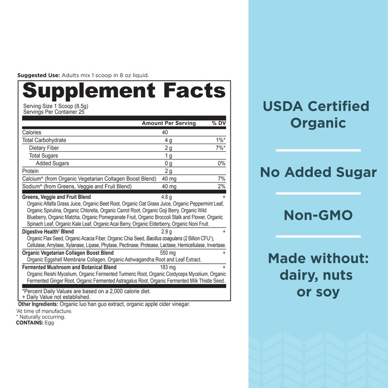 - SIMPLE AND EASY TO USE: Add one scoop to water, juice or your favorite smoothie recipe to easily up your daily greens. This mixable powder is full of nutrients sourced directly from premium superfoods like organic eggshell membrane collagen as part of the Organic Vegetarian Collagen Boost Blend. This superfood combination gives you the joint, gut and skin support you're looking for in one simple scoop..