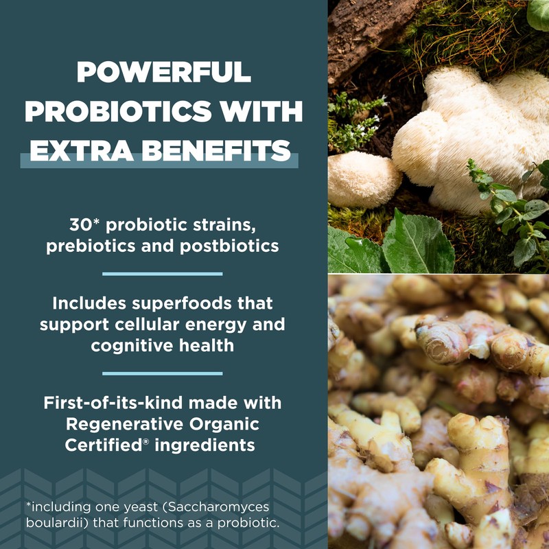 - Get the extra gut health support you crave. This first-of-its-kind Regenerative Organic Certified Extra Strength Probiotics brings you 50 billion CFUsV from 30 diverse probiotic strains*, including resilient soil-based organism (SBO) probiotics and lactic acid bacteria (LABs) – as well as prebiotics, postbiotics and mushrooms grown on our founder-owned ROC farms.