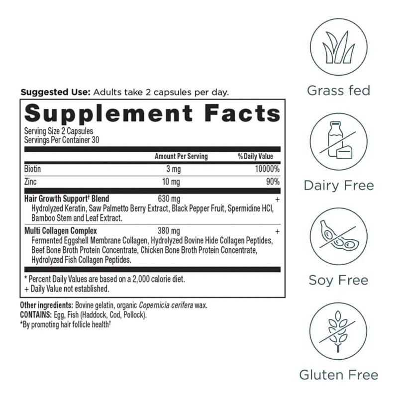 Cabello visiblemente más grueso y lleno en 3 meses: ingrediente clave clínicamente validado para apoyar un ciclo de crecimiento del cabello más saludable, reducir la rotura y aumentar el brillo del cabello en un 47%, todo en solo 90 días.; 10 tipos de colágeno de fuentes reales de alimentos: presenta una mezcla única de 10 tipos de colágeno, incluido el colágeno de membrana de cáscara de huevo fermentado, que, cuando se combina con queratina solubilizada, puede apoyar el cabello, la piel y las uñas.; Formulado con queratina solubizada clínicamente validada: esta fórmula fortalece el cabello, promueve el brillo y el grosor, y apoya la salud del folículo. También ayuda a reducir la apariencia de arrugas y mejorar la resistencia de las uñas.; Soporte para el cabello alimentado por superalimentos: Formulado con una mezcla de potentes superalimentos como la palma enana americana y la baya de árbol casto, además de un ingrediente clave para reforzar la resistencia a la tracción del cabello y apoyar el ciclo de crecimiento del cabello.; Limpio, cómodo y eficaz: solo 2 cápsulas fáciles de tomar por día con una bebida; ingredientes de origen responsables con los que puedes sentirte bien, con resultados reales que puedes ver y sentir. Todos nuestros productos estan en inglés SKU 100625047905