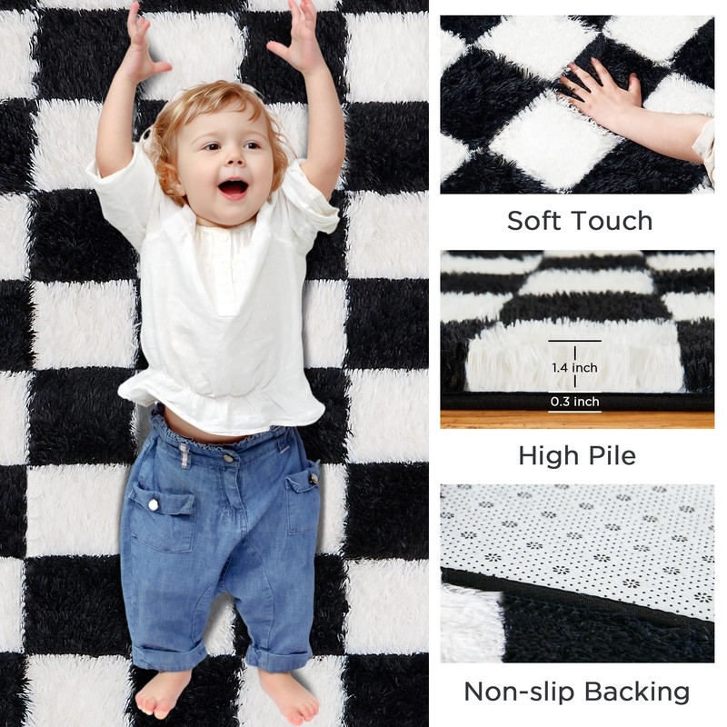Andency 3x5 Ft Black and White Area Rug for Living Room Classic Checkered Shaggy Rug Non-Slip High Pile Soft Fluffy Rug Fuzzy Carpet Bedroom Kids Toddler Room Nursery Playroom, Cute Dorm Home Decor