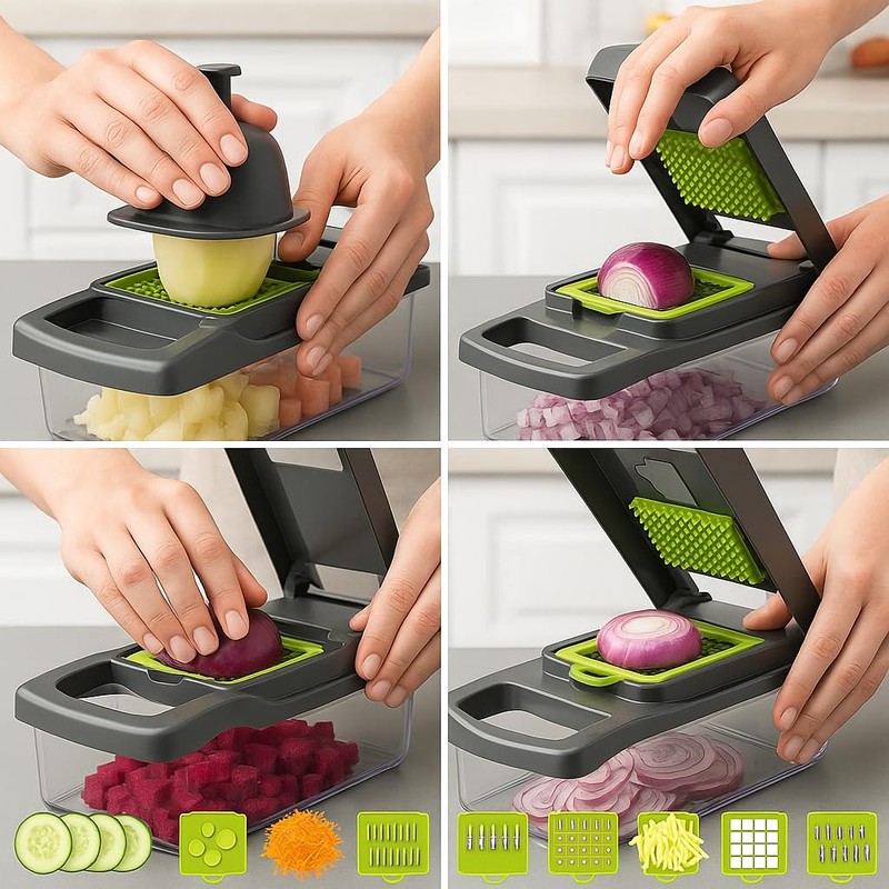 - 14-in-1 Multi-Function Set – Includes interchangeable stainless steel blades for slicing, dicing, chopping, grating, julienning, and more.