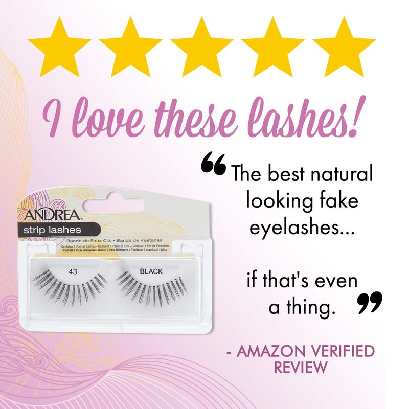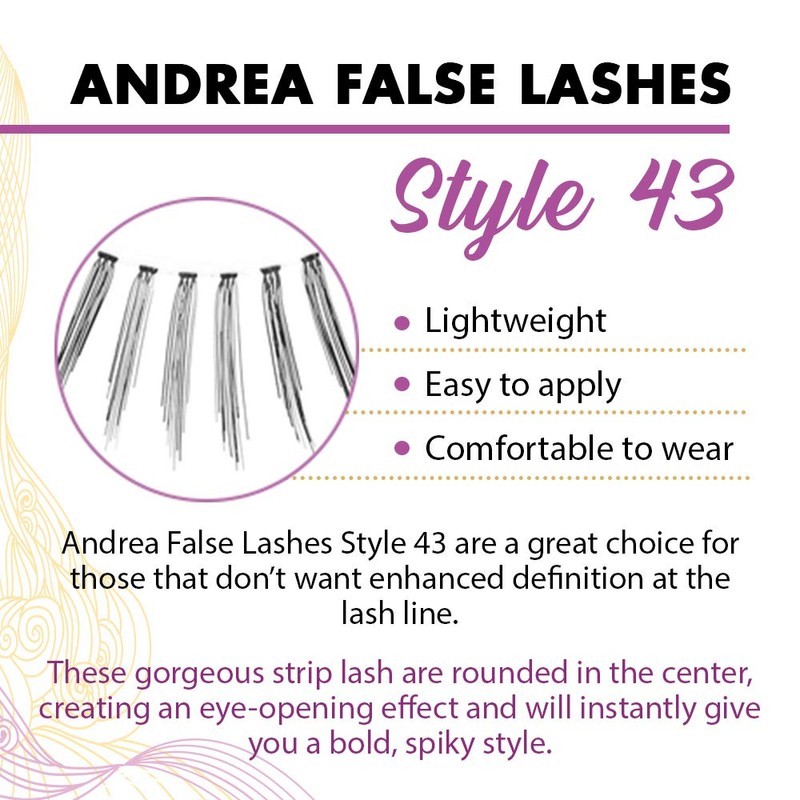 - BLENDS SEAMLESSLY FOR A FLAWLESS FINISH: Andrea False Lashes Style 43 Black are a great choice for those that don’t want enhanced definition at the lash line, as thick black lash bands can often give the effect of eyeliner. They are lightweight and fairly natural-looking too, by the time someone comments on how full your lashes look, you'll forget you even had them on!