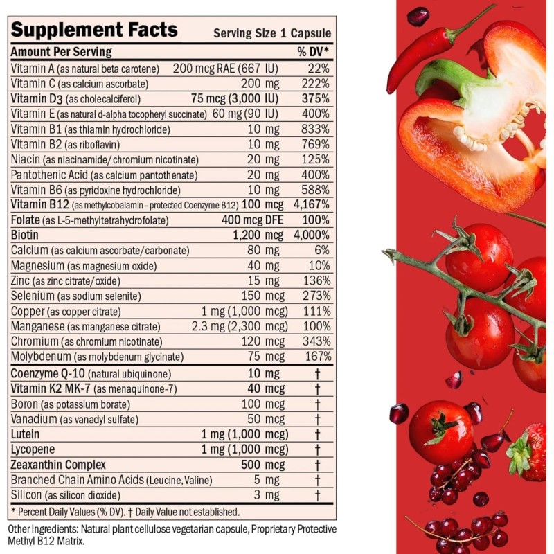 Andrew Lessman's ESSENTIAL ONE is a uniquely pure alternative to all the problems and additives of multivitamin tablets and gummies. Our small, easy-to-swallow capsules are gentle to even the most sensitive stomachs. We ensure these vitimins contain all key nutrients provided in their proper forms and at their most beneficial levels, making this an excellent option for multiple vitamins for seniors, and men and women of all ages.We set out to make the best multivitamin for women and men. Essential One provides high potencies of Vitamin D3 (3,000 IU), Methyl B12 (100 mcg), along with a complete B-Complex, including 5-Methyl Folate (not ordinary Folic Acid) and 40 times more Biotin (for beauty) than the leading brands. We provide all three critical and costly carotenoids; Lutein, Lycopene and Zeaxanthin; along with a dozen other essential nutrients, including Mother Nature's most important nutrient made for energy production and cellular protection-Coenzyme Q10.Essential One provides all the convenience and affordability you seek in a multivitamin without the stomach upset, additives and other problems of large, hard-to-swallow and difficult-to-digest multivitamin tablets or their even more calorie-laden, candy gummy cousins. Make it part of your daily ritual to take this exceptional multi vitamin by Andrew Lessman.Our ultra-high potency, comprehensive, one capsule daily multi-vitamin-mineral formula contains 25+ multiple vitamins, and nutrients including CoQ10, lutein, lycopene, zeaxanthin and many more.