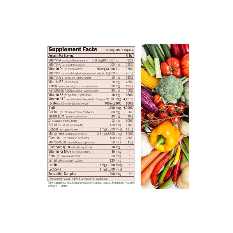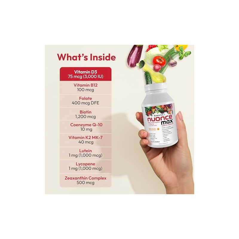 • Ingredientes 100% puros y bioactivos – fórmula especial Essential One, para hombres y mujeres, proporciona 3000 UI de vitamina D3, más niveles más altos de nutrientes clave: Todas las vitaminas del complejo B, biotina de 500 mcg, luteína de 1000 mcg y licopeno, ceaxantina de 500 mcg; y vitamina E cristalina de 60 mg; no están presentes en la mayoría de las multivitaminas a cualquier precio. También: Calcio, zinc, cromo, niacina, selenio y otros. Sin leche, soya, levadura, trigo, gluten, sodio, sal, azúcar, almidón, grasa.