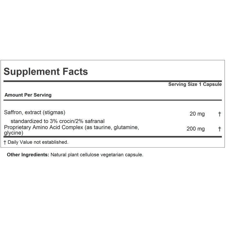 - SUPERIOR Pure BIO-ACTIVE INGREDIENTS – Delivers standardized extracts of Crocin and Safranal from Saffron extract and a Proprietary Amino Acid Complex (Taurine, Glutamine, Glycine). Contains NO Milk / Dairy Free, Gluten Free; NO soy, yeast, corn, wheat, sodium, salt, sugar, fat, cholesterol, color, preservative, common allergens or manufacturing additives.