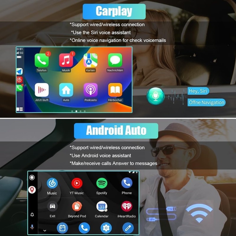- 【Wireless CarPlay & Android Auto】~Supports CarPlay/Android Auto connect via Bluetooth, project the contents of your phone to the large screen of the host, and you can share your favorite 1080P videos, high-definition pictures, etc. Easily access your phone to make calls, navigate, play music or manage other apps via Siri/Google controls