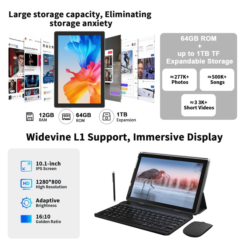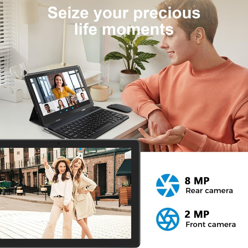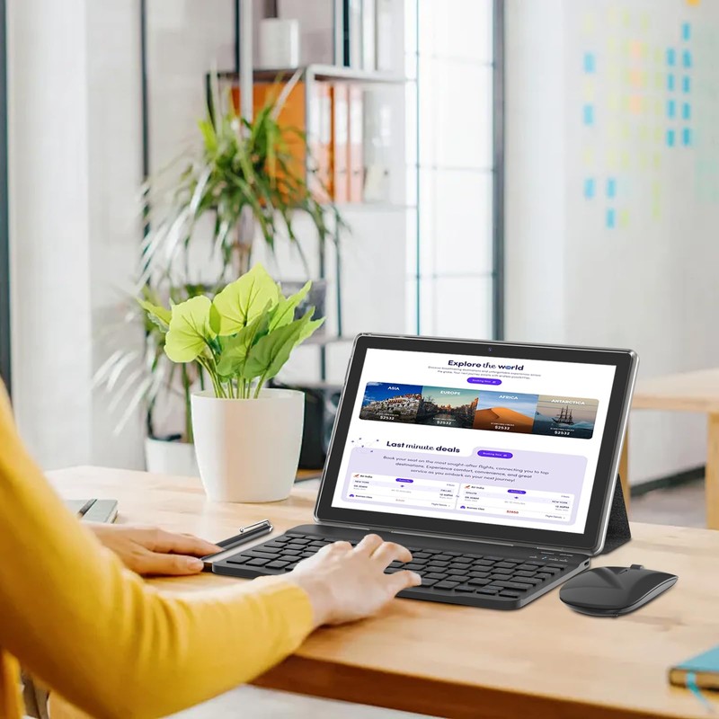 - 【Portable 2 in 1 Tablet with Keyboard】 This 10.1 inch android tablet equipped with a bluetooth keyboard, wireless mouse, and stylus as well as a foldable protective case, allowing you to seamlessly transform your 10'' tablet into a laptop-style device. This versatility makes it the ideal device for those who need to be productive on the go, whether it be for work, study, or play.