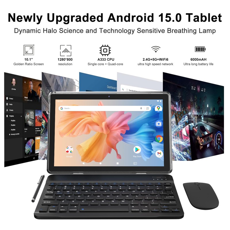 - 【10.1 inch Touchscreen & HD Camera】 The android 15.0 tablet has a 10.1 in IPS display, 1280x800 resolution, a tablet with sensitive screen sensing, equipped with 8MP+2MP dual cameras, narrow edge screen design. The high-definition screen brings you more detailed natural colors and advanced visual effects. The "reading mode" can reduce harmful light to the eyes so you get to enjoy a comfortable night reading.