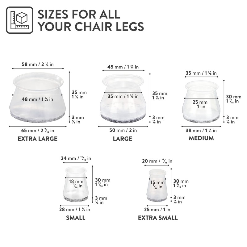 - Common Size: Can adapt to every kind of chair leg shape: round, square, etc. Perfect for chair legs with a round diameter of 1-1/4" - 1-9/16" (32-40mm), a square length of 15/16" - 1-3/16" (24-31mm), and a circumference of 3-13/16" - 4-15/16" (97-125mm)
