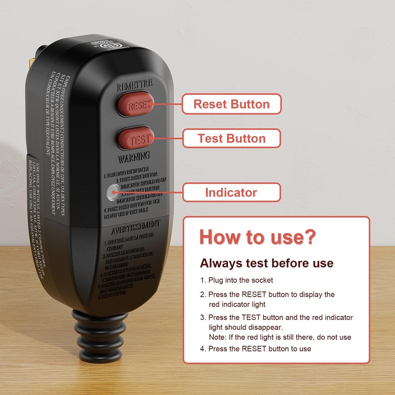 - 【Clear Instructions】Power indicator lamp goes OFF if GFCI trips, power is interrupted or GFCI is unplugged. To test and use, just keep connecting, press the TEST button, the indicator light should be off; press the RESET button, the light should be on.
