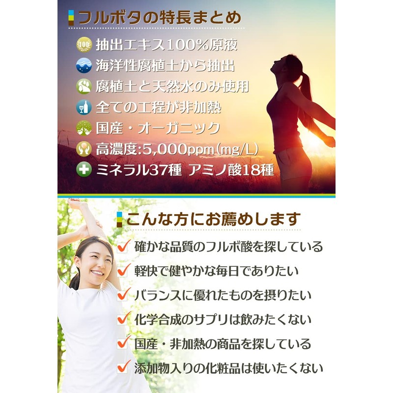 フルボ酸エキスやフルボ酸飲料において高レベルの平均5,000ppm(5,000mg/L)のフルボ酸を含有。