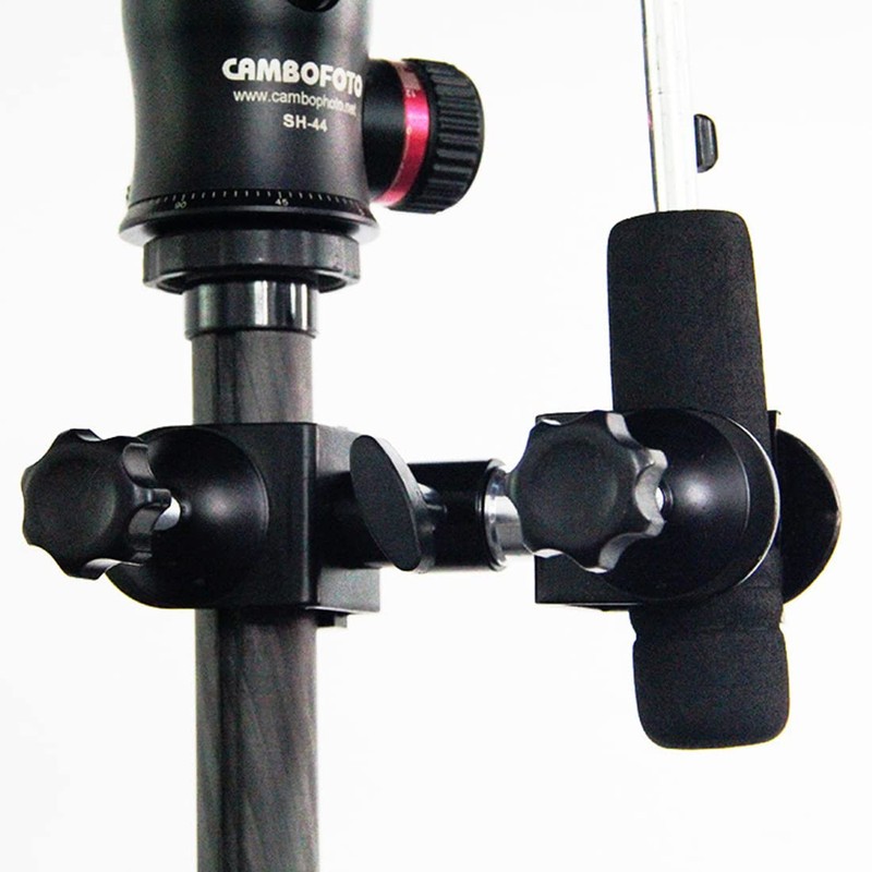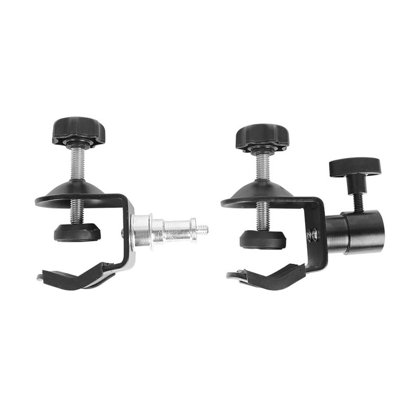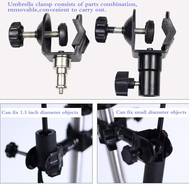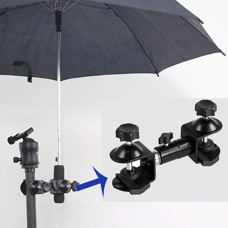 - Umbrella clip dual c-shaped clamp for camera, one end to clamp tripod axis, the other end to clamp umbrella handle .It can be clamped on the tripod center axis or the tripod three legs.