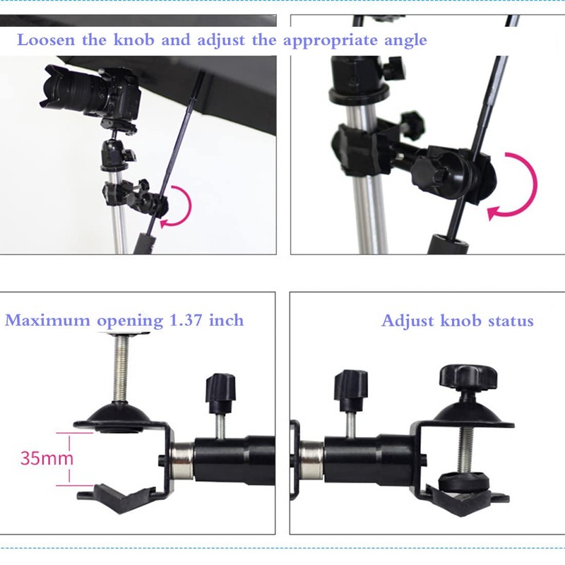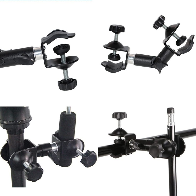 This double clamp can mount virtually everywhere you need such as cameras, lights, photography reflectors, umbrellas, hooks, shelves, plate glass, crossbars, even other super clamps. Features Strong jaws that open up to 35mm 100% brand new and high quality Rubber pad protects the surface it clamps Anodized aluminum treatment and strong construction High-strength metal and locking system to give good support Dual U-shape clamps to conveniently mount to light stands and boom arm Dual U clamps can be detachable to use as a crossbar clamp or flash support separately
