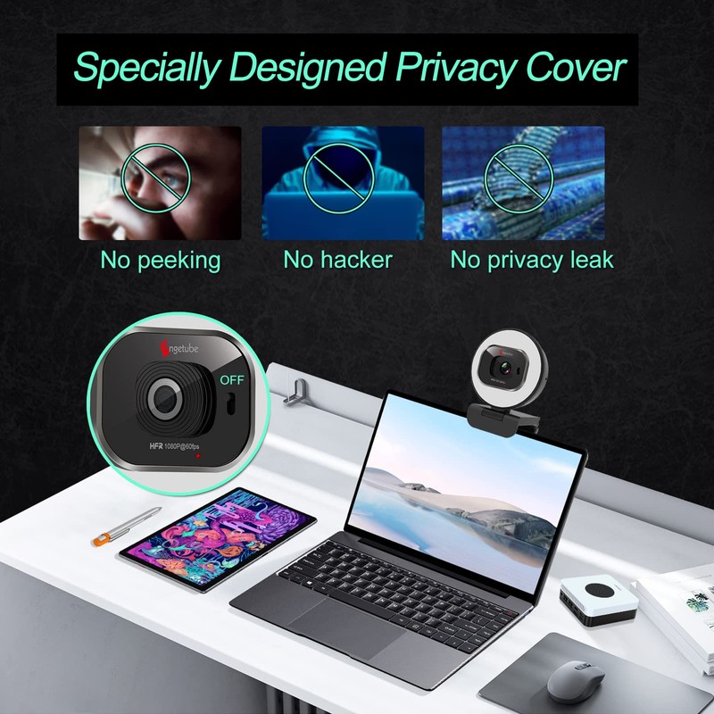 Angetube Webcam 1080P 60FPS with Ring Light, HD USB Streaming Web camera with Privacy Cover Autofocus Built-in Microphone for Computer PC Laptop Mac