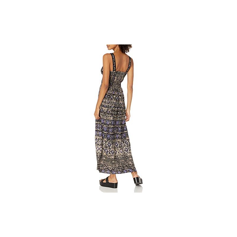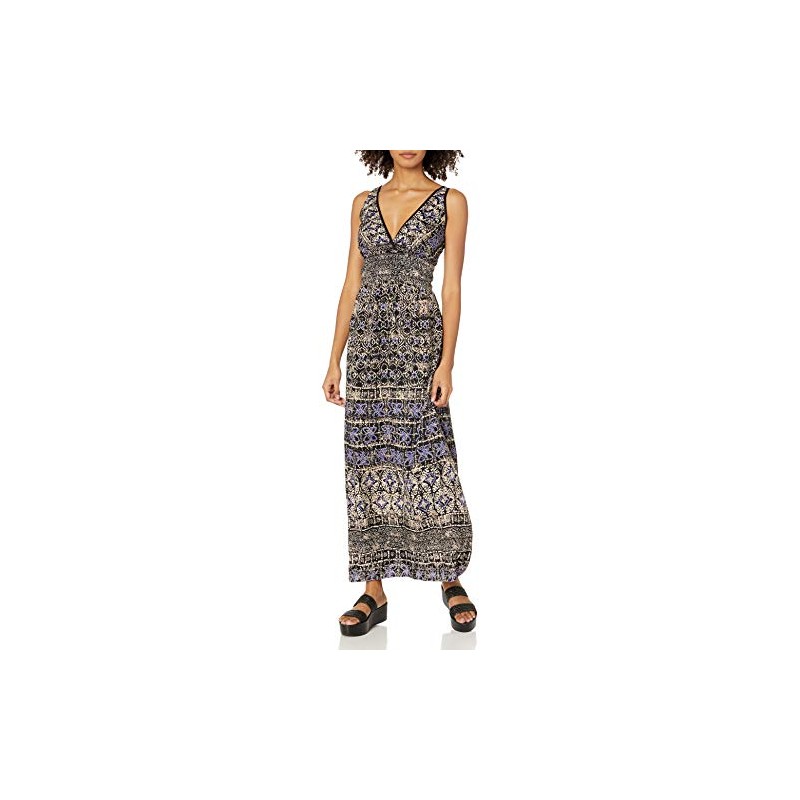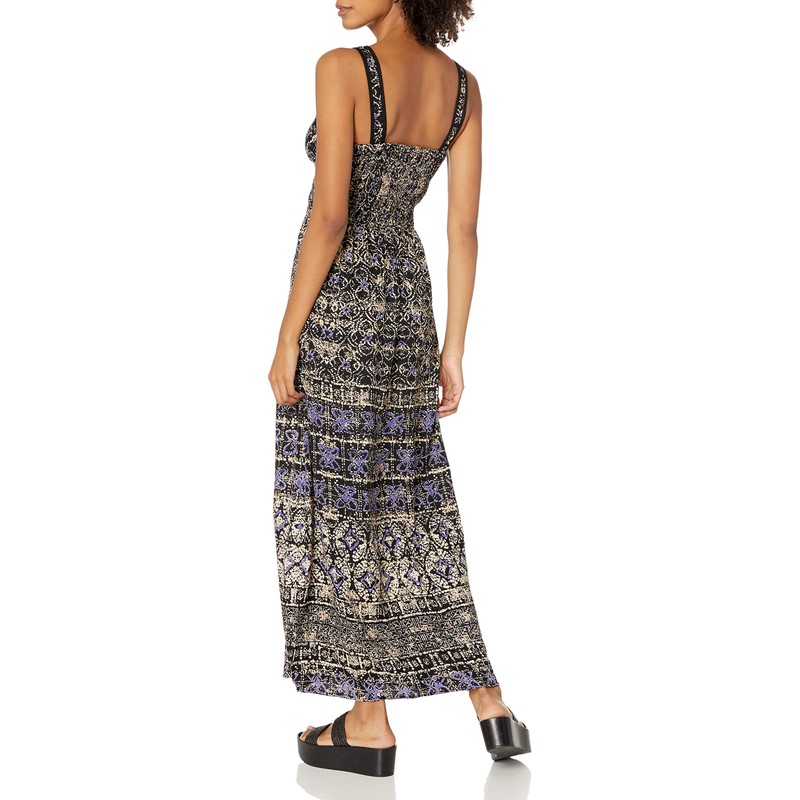 - Sleeveless maxi in allover print featuring deep V-neckline and wide smocked waistband