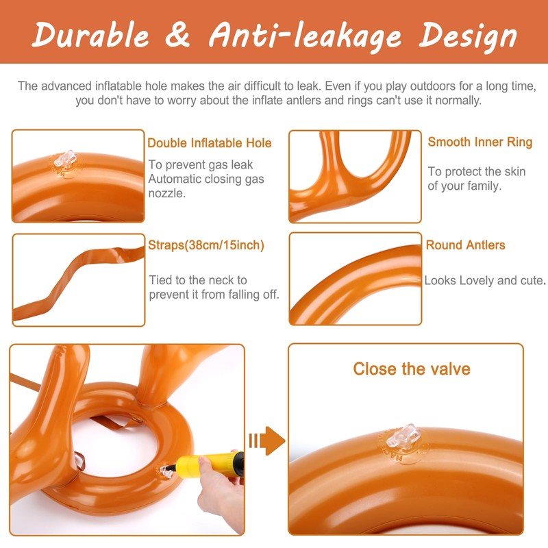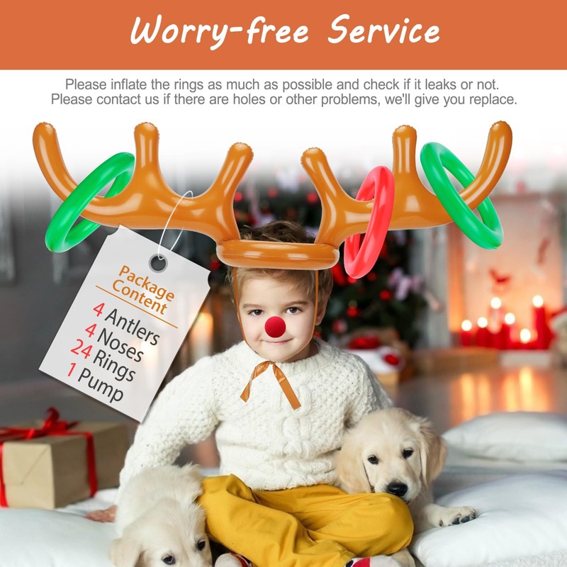 - 【Happy Game for Multiple Player】This Inflatable Reindeer Antler Ring Toss Game is a perfect addition to your Christmas party supplies. The inflatable antler with straps can be worn on the head and the amusing red nose just adds more fun to the game!(4 sets, double your joy!)