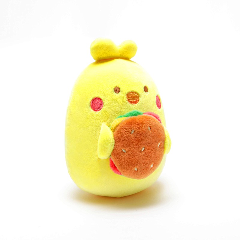 - ANIMAL WITH FOOD DESIGN – Featuring an original rounded body design for maximum cuteness, these small yet playful plushies come in various colors, each adorable animal holding their own favorite food item! Choose your desired furry animal: bunny with hot dog, chick with burger, fox with fish, kitty with strawberry roll cake, owl with pancake, panda with banana, and puppy with burrito. These super squishy 3.5inch plushies are designed to be long-lasting treasures. Great for animal lovers!