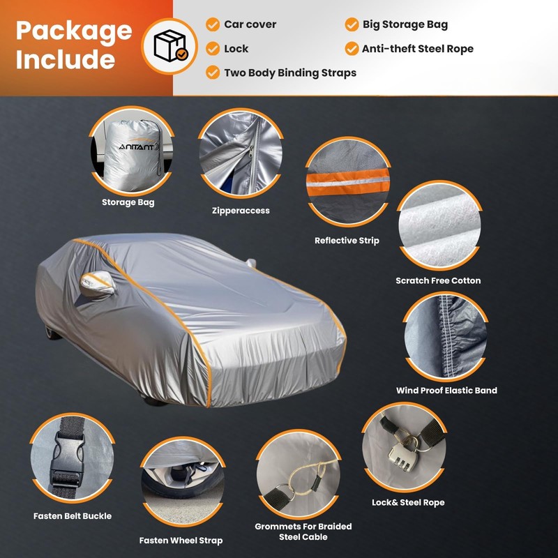 - Design FeaturesKey design elements include:: 1.Windproof elastic edge: The elastic bands at the front and back ensure a comfortable fit. 2. Fastening straps: In windy weather, using 4 tire straps and underbody straps can stabilize the car cover. 3. Driver's side zipper: Allowing for easy access to the vehicle without the need to completely remove the car cover. 4. Anti-theft steel wire ropes and locks: Prevent theft. 5.Reflective stitchingEnhances nighttime visibility for added safety.