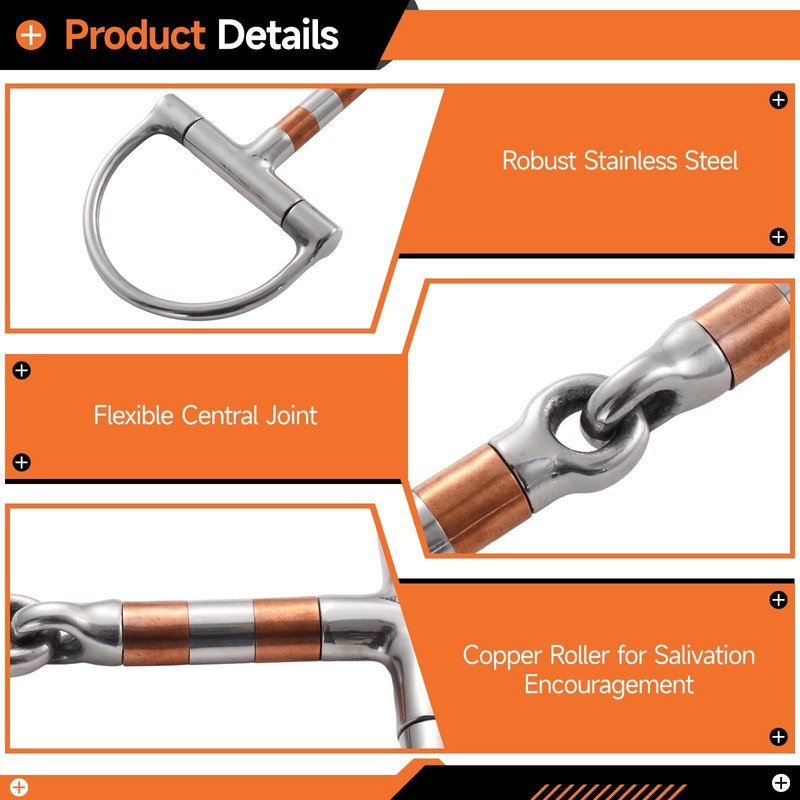 • Flexible Central Joint: Features a flexible central joint with copper roller; allows smooth and gentle movement; the copper roller encourages salivation and relaxes the horse's jaw for a more comfortable fit