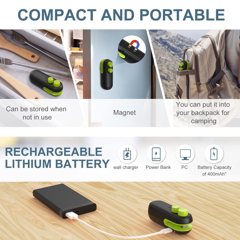 - Built-In Rechargeable Lithium Battery- Our bag sealer heat seal comes with a built-in rechargeable lithium battery with a 400mAh capacity. You can conveniently charge it using the included micro USB charging cable. Say goodbye to disposable batteries and save on costs! Once fully charged, this device can last for over a month, making it an eco-friendly choice.