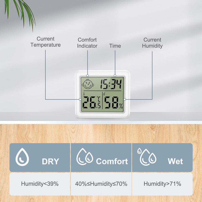 - Air comfort indicator? The moisture meter with moisture sensor has a face symbol that displays dry/comfortable/moist air conditions. Thanks to the intelligent function, you can adjust the environment in time.