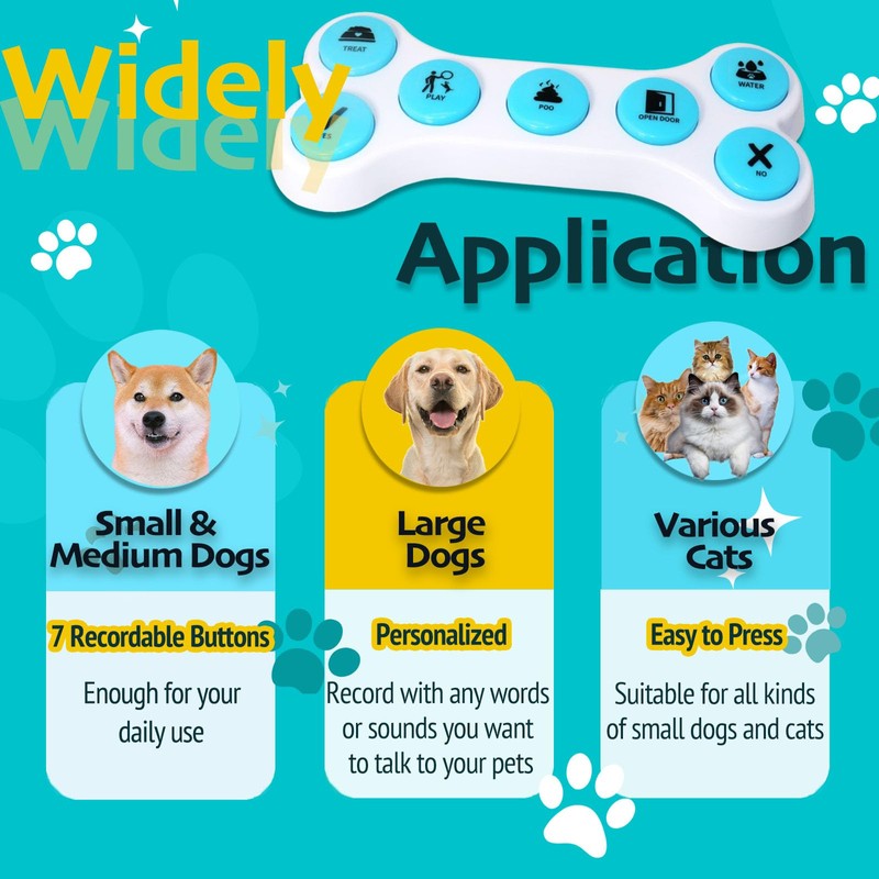 - Dog Buttons For Communication: By recording commands like 'FOOD', 'EAT', 'DRINK', 'PLAY', 'YES', 'NO', and more, you can establish a means for your pet to express their needs and desires. The dog talk button set is suitable for all types of dogs, whether they are small, medium, or large breeds