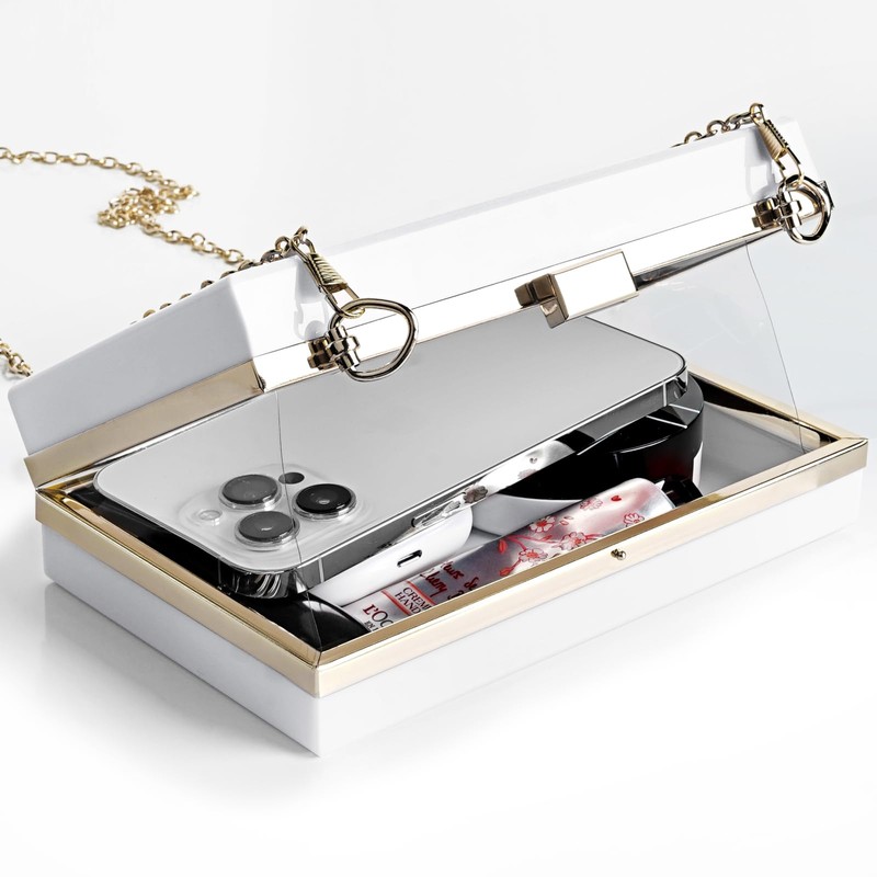 ANLINKSHINE Women Clear Purse Acrylic Clutch Bag, Evening Acrylic White Clutch Bag, Crossbody Evening Bag, Shoulder Handbag With Removable Gold & White Chain Strap, White
