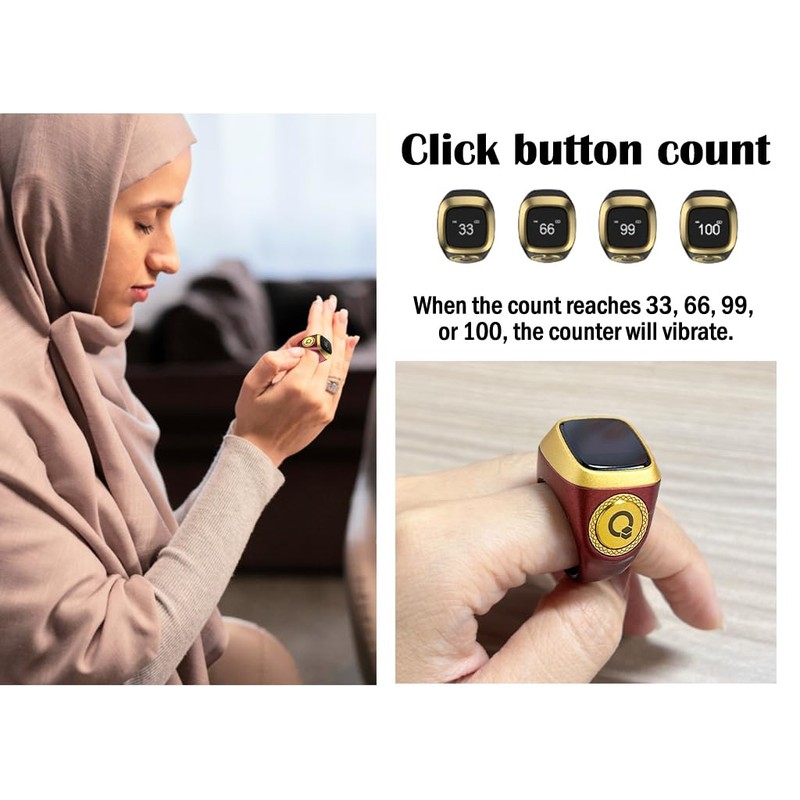 - 💫 Smart Vibration Alert: The tasbih counter smart ring has a button that can be clicked to count. When the count reaches 33, 66, 99 or 100, the smart ring counter will vibrate. Use a tasbih counter smart ring to easily track your daily Tasbeech count anytime, anywhere.