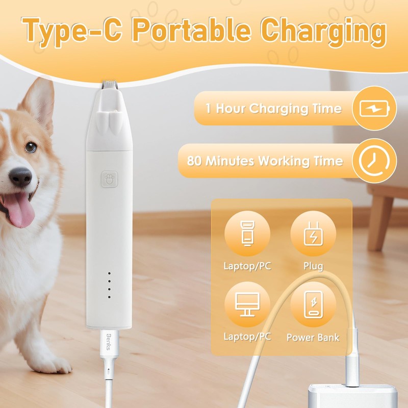 - 🐾USB Rechargeable Dog Clipper: This rechargeable dog hair trimmer uses a large capacity battery (14500-500mAh), which only takes 1 hour to charge and can be 80 minutes in standby mode. The dog hair trimmer is equipped with a USB charging cable and you can conveniently charge it via a mobile power bank, computer or power supply