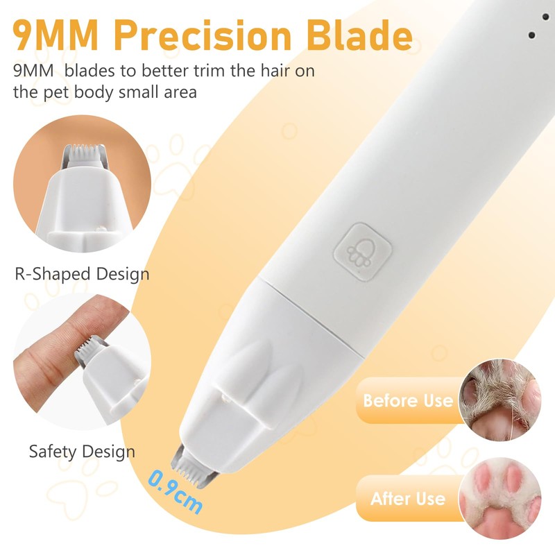 - 🐾9mm precision blade: the dog paw trimmer is equipped with ceramic blades and stainless steel blades, which are sharper and more durable; the blades are circular serrated, which allows the hair to be cut quickly without scratching your pet. The 9 mm ultra-fine blade head is better suited for trimming hair in sensitive areas of dogs and cats (face, eyes and claws)