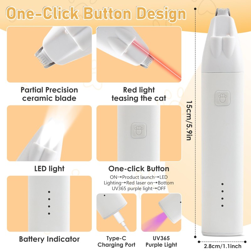 - 🐾Multifunctional: This is not only a clippers dog cat, but also an interactive toy for cats and dogs, a pet moss detector. The product is equipped with LED lighting + LED pointer + UV365 purple light. The LED pointer cat dog toy can be used for interactive games with cats and dogs. The UV365 purple light mode can detect fluorescent substances, identify and check money and check pet fluids