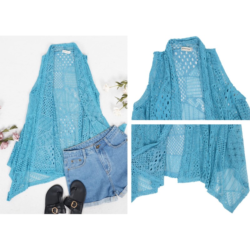 Anna-Kaci Women's Plus Size Bohemian Draped Open Front Crochet Bikini Cover Up Cardigan Vest, Blue, XX-Large-3X-Large