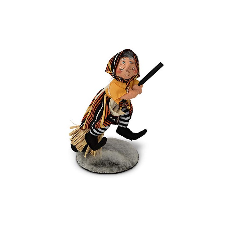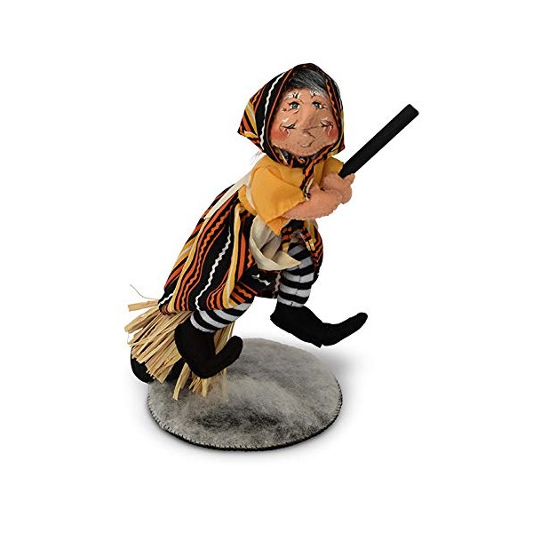- This 9 inch witch is taking flight on a black wooden spoon covered with raffia. It is placed upon a wire frame base for stability and the witch is perched upon it in flight.