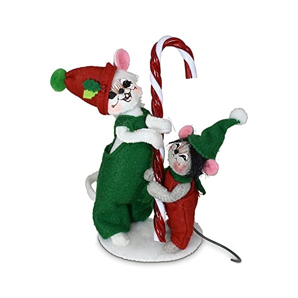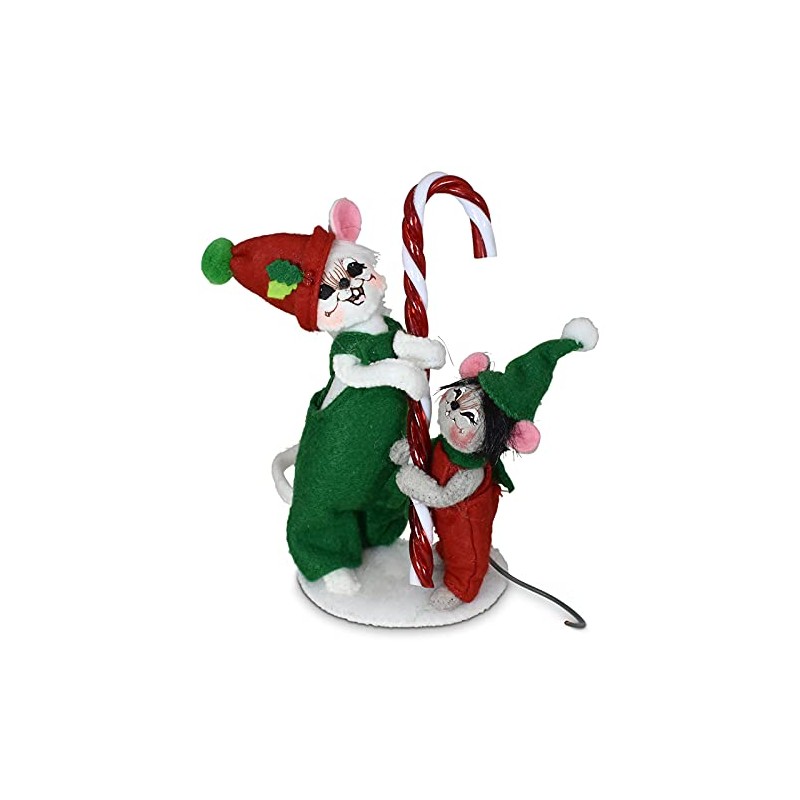 • The 5 inch white mouse wears green felt overalls and a red felt hat with green pom. The 3 inch gray mouse wears red felt overalls and a green felt scarf and hat. They’re holding onto a plastic candy cane while standing on a snowy white felt base.