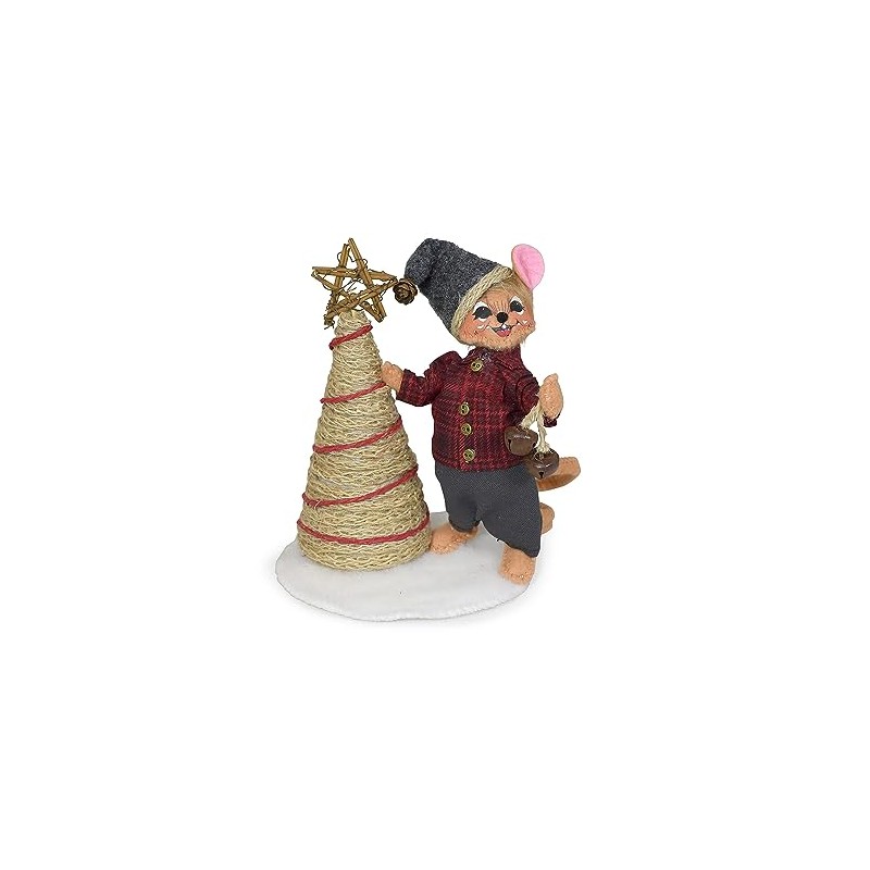 - The 5 inch amber mouse wears a shirt made with our signature Plaid and Pine fabric, gray pants, and a heather gray felt hat with a pinecone at the tip. He’s holding a rustic jingle bell accessory and stands next to a Christmas tree made of jute twine with a grapevine star at the top!