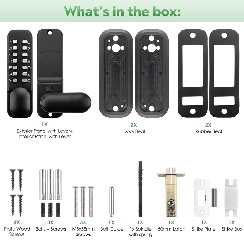- Full Mechanical Keypad Door Lock: No batteries, power or wiring required.Reject complex and unstable electronic programming which is prone to failure.No longer worry about forgetting to replace the batteries, or take the keys and being locked out