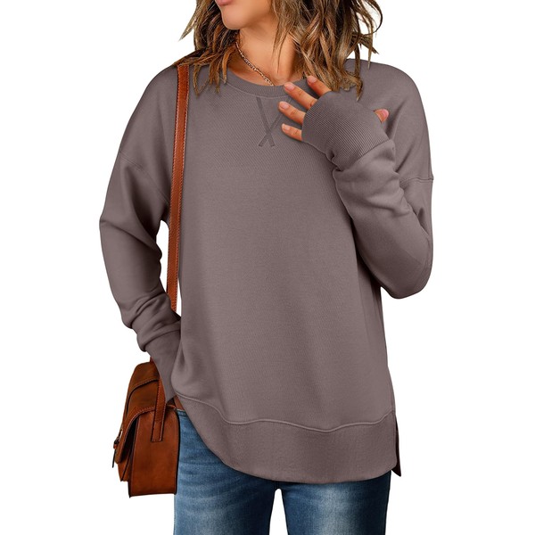 ANRABESS Sweatshirts for Women 2025 Fall Long Sleeve Shirts Oversized Crewneck Lightweight Side Split Casual Pullover Tops Camel Large
