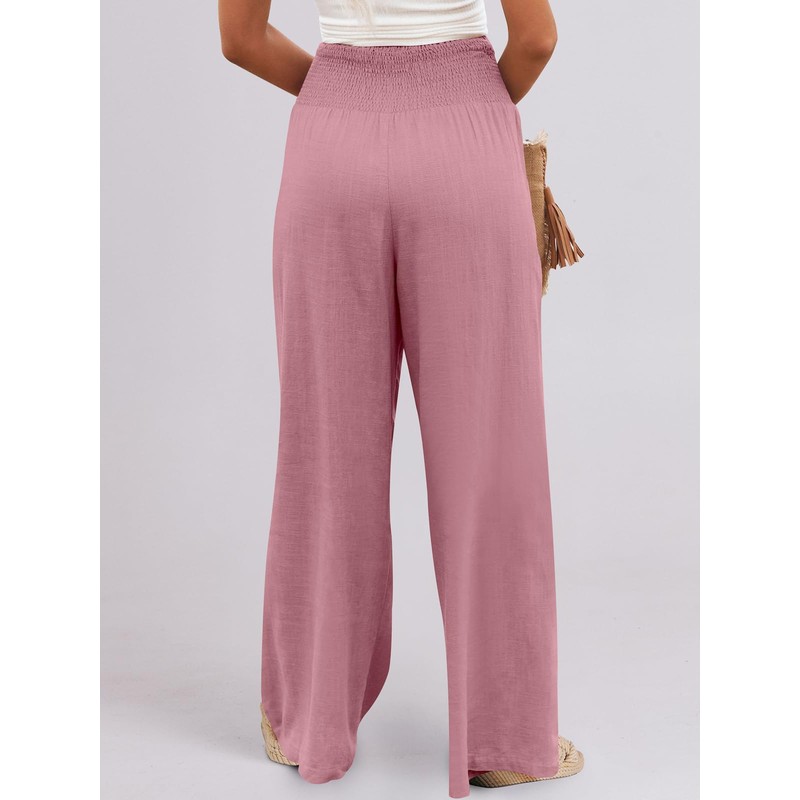 ANRABESS Women Linen Palazzo Pants Summer Boho Wide Leg High Waist Casual Lounge Pant 2025 Beach Travel Vacation Outfits Pink Medium