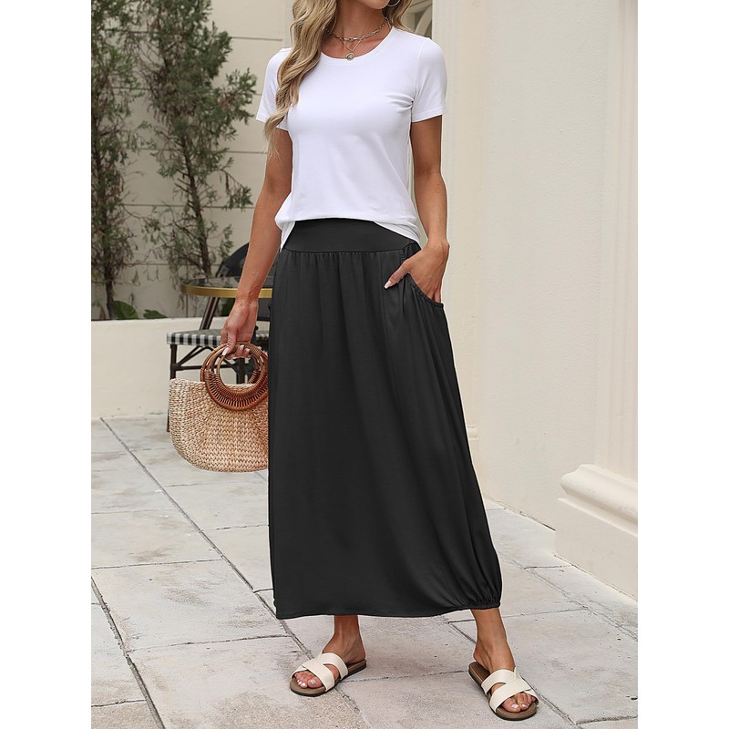 ANRABESS Women's Summer Long Maxi Skirts 2025 Trendy Ankle Length High Waisted Boho Flowy Beach Skirt with Pockets Fashion Black X-Large