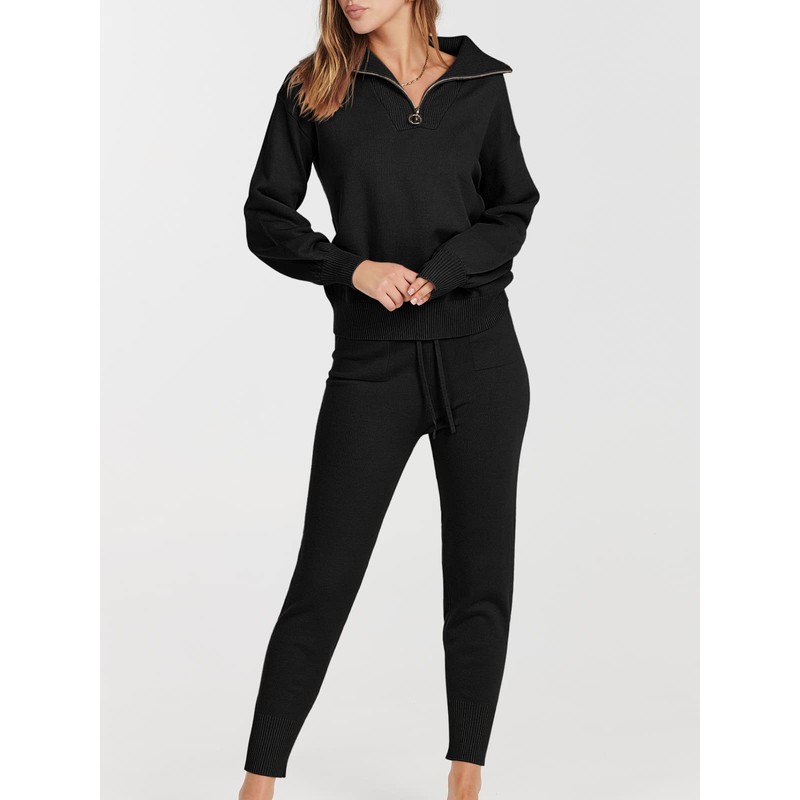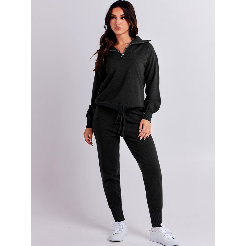 ANRABESS Women's Two Piece Outfits Sweater Sets Long Sleeve Zip Up Knit Pullover Jogger Pants Tracksuit 2024 Fall Lounge Sets Black X-Small