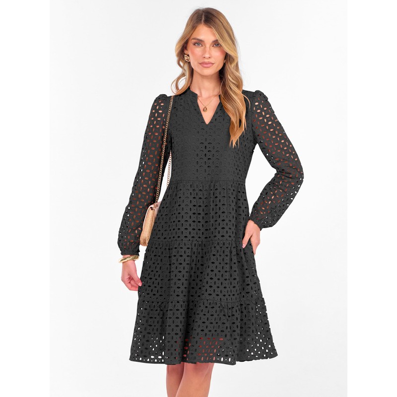 ANRABESS Womens Long Sleeve V Neck MIdi Dresses Hollow Out Eyelet Casual Tiered 2025 Fall Beach Vacation Dress with Pockets Black Large