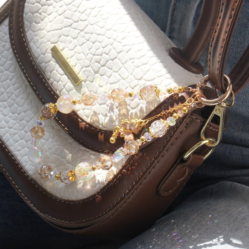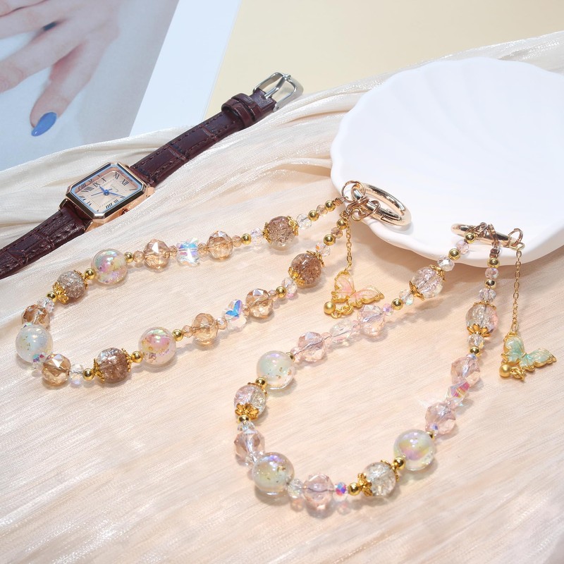 - Beaded Crystal Charms: This is a hands free phone chain with a butterfly pendant. One is citrine and the other is pink crystal. A good choice to decorate phones, cameras, purses, and handbags to express your own personality.