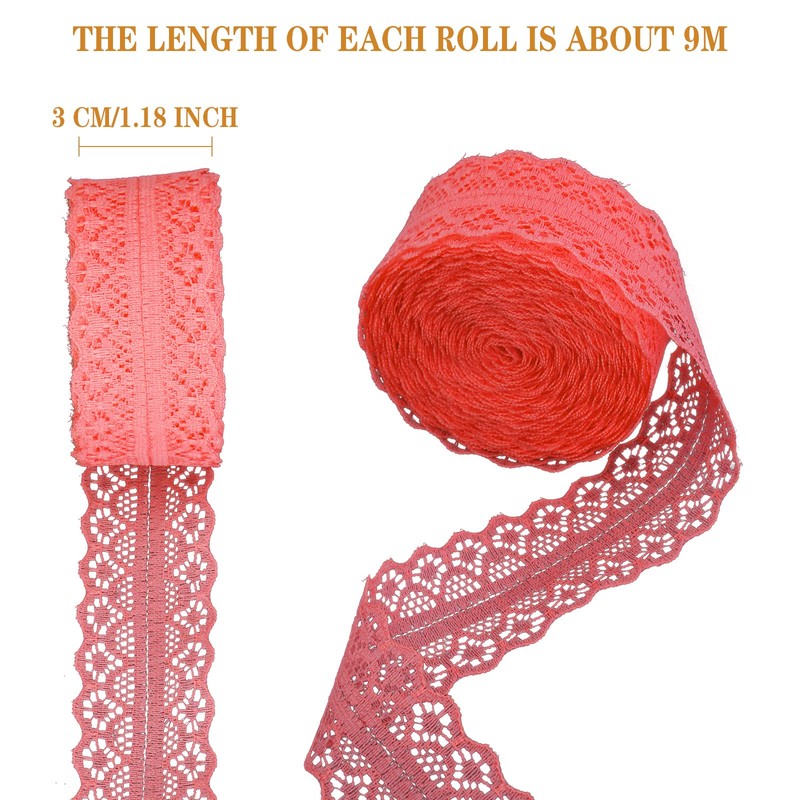 - Package Includes: The package comes with 12 rolls lace ribbon assored in 12 different colors, 9m long per roll, 3cm wide, lace ribbon comes in rolls, can be cut freely according to your various need.