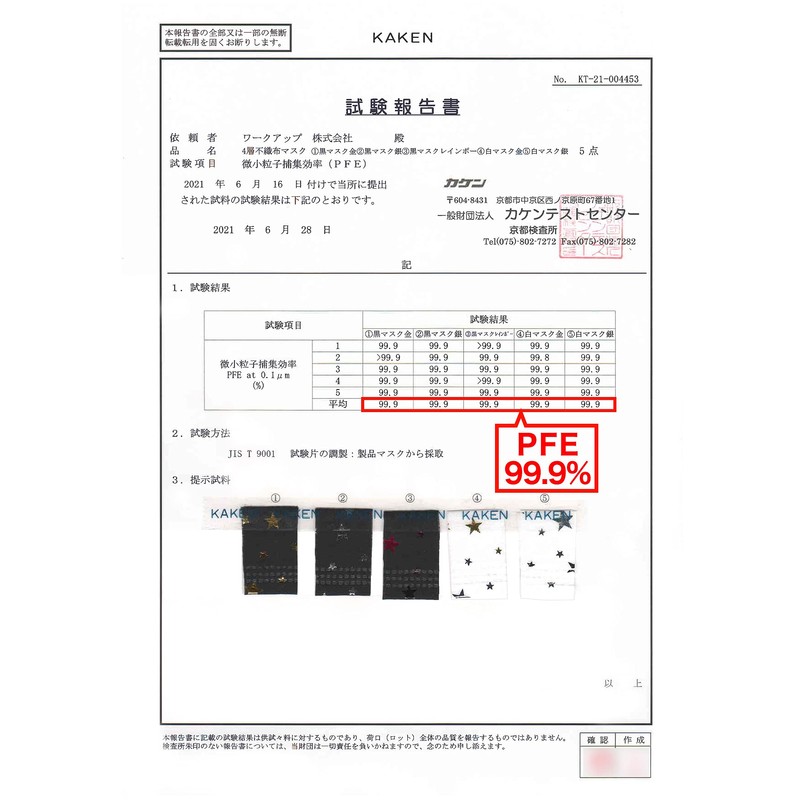 Performance test: Average value 99.9% of particle filtration efficiency testing with PFE (0.1μm particle diameter test particles)