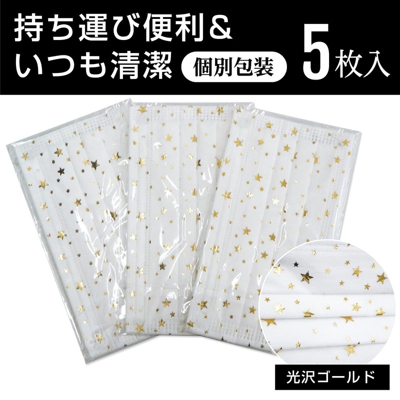 Anshinya Star Pattern White Mask, Sparkly Gold (Gold) 4 Layers, Non-woven Mask, Unisex, Individually Packaged, PFE, 99% or More, Pack of 5