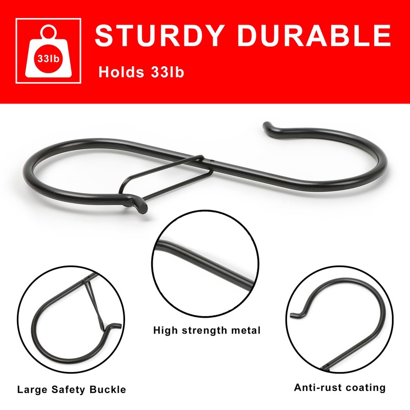 - Easy to use - Both ends of the S hook can be used to hang items, and the safety buckle end can be used on rods with a diameter of 0.7 inches (max), as well as on shelves, closets, bathrooms and gardens.