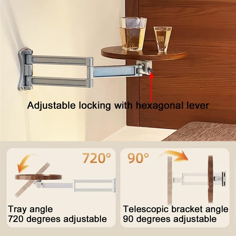 • FLEXIBLE ADJUSTMENT,SPACE SAVING: Floating bedside table folding brackets adjustable up and down by 90 degrees,The plane can be rotated 360 degrees,Effortlessly find the most suitable angle,Funky side table rotatable folding bracket ultimate convenience and space saving,Mini table retractable brackets can be used in the living room,Bedroom,Balcony,Bathroom and other places